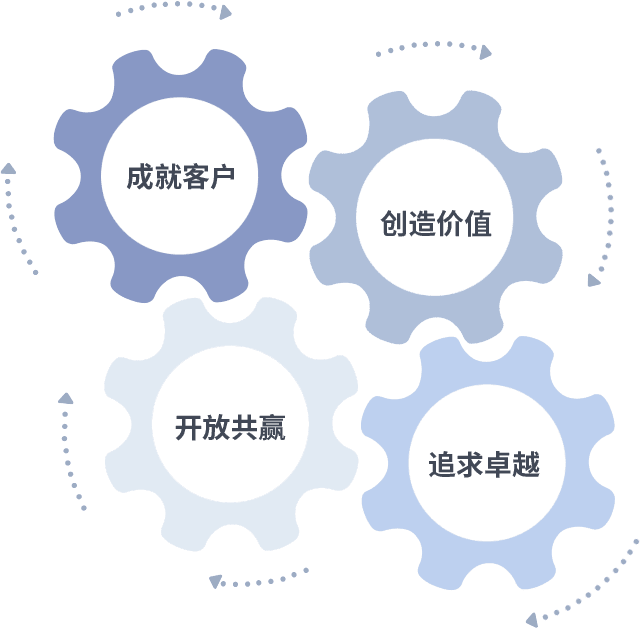 成就客户是一切决策的出发点,,创造价值是衡量所有工作的标准,,追求卓越是我们做事做人的态度,,,开放共赢是我们的格局也是最终的结果。。。。价值观的齿轮环环相扣,,,推动着组织里的每个人不断向前。。。。