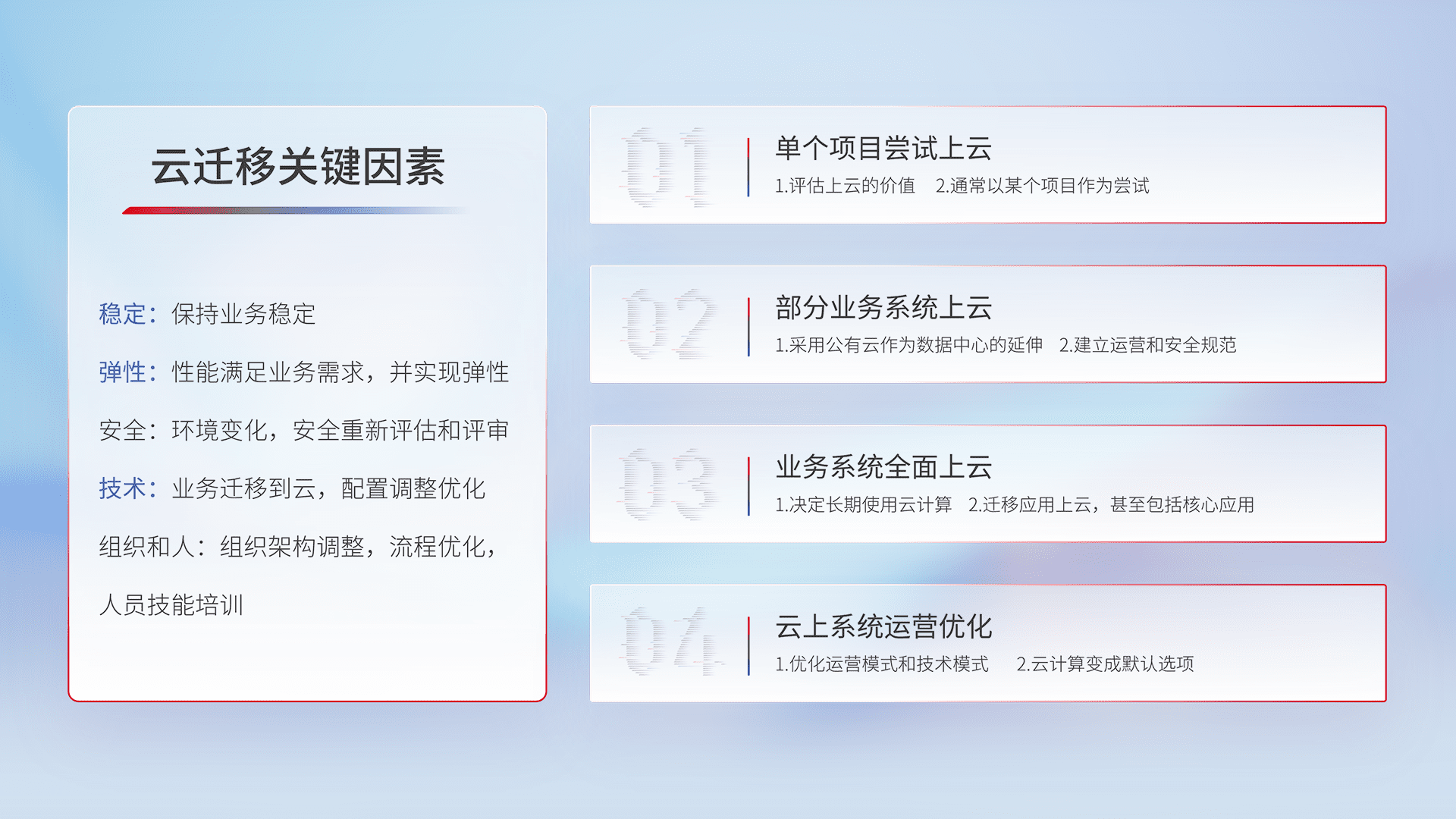 结合实际业务,,,从规划设计、、、、云平台选型、、、云原生改造、、、数据迁移、、、、集成交付,,迁移全过程为客户识别最佳上云路径,,,做好风险识别管理,,,设计网络架构、、身份权限、、安全审计合规、、、、操作审计、、、日志审计、、、、监控告警策略、、、多站点容灾设计等,,,对云上基础设施进行整体规划,,,提升IT治理水平,,,,以满足弹性、、高可用、、高性能的需求。。