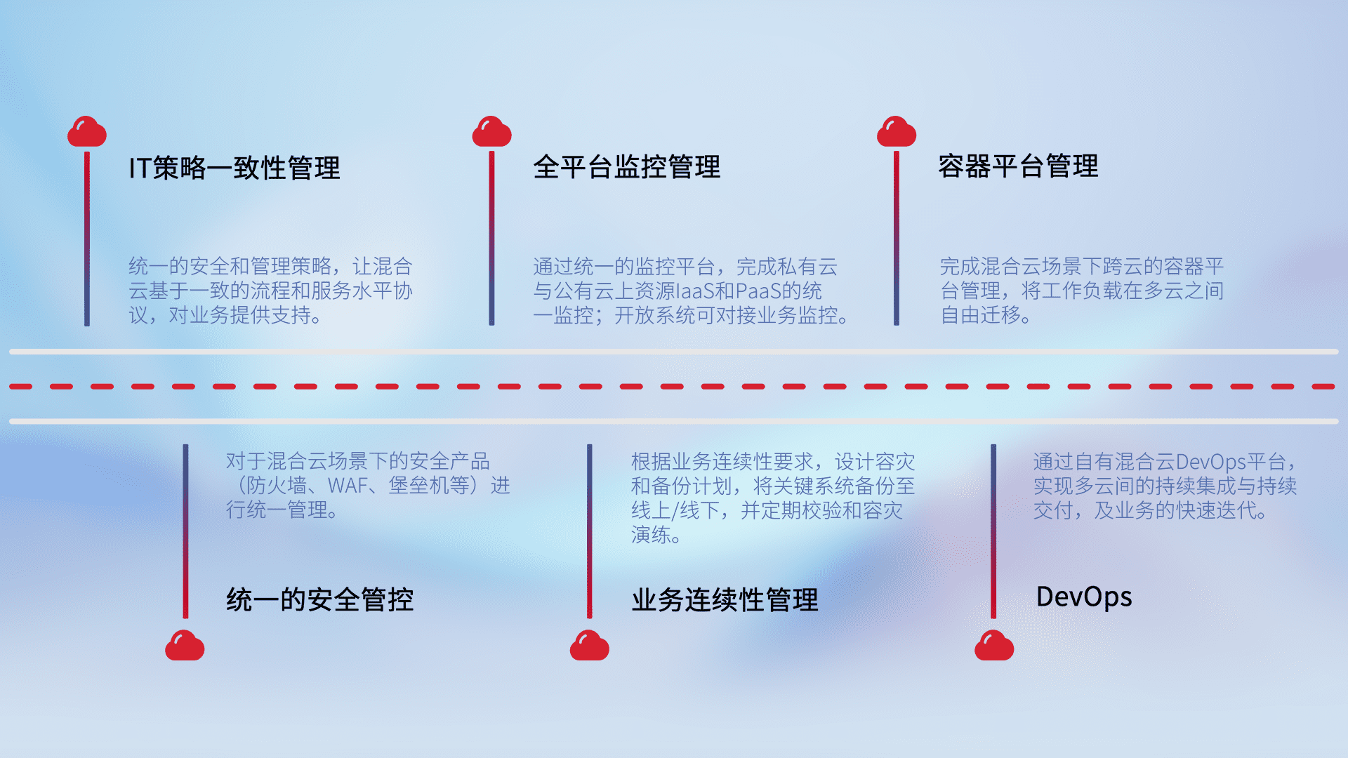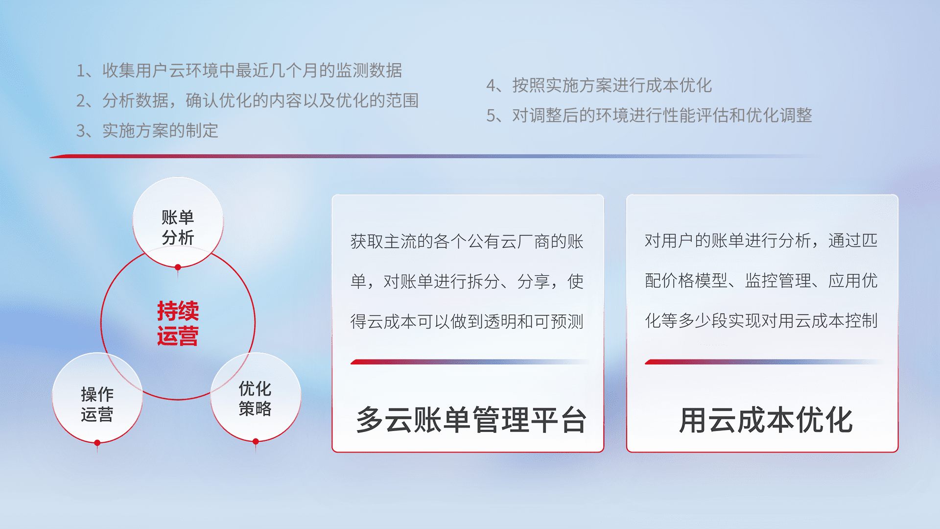 通过多云纳管,,,,以统一的资源数据模型把客户的云资源进行抽象和封装,,,,进而实现对多云资源的统一操作,,,保障云资源管理的可靠性、、、稳定性与可用性。。量身定制化运维内容,,配置、、、、开发运维、、、、补丁管理、、备份、、、、监控、、、、认证和访问管理、、、、审计和日常巡检等,,,保障在用云过程中的可靠度,,稳定度以及高可用率。。