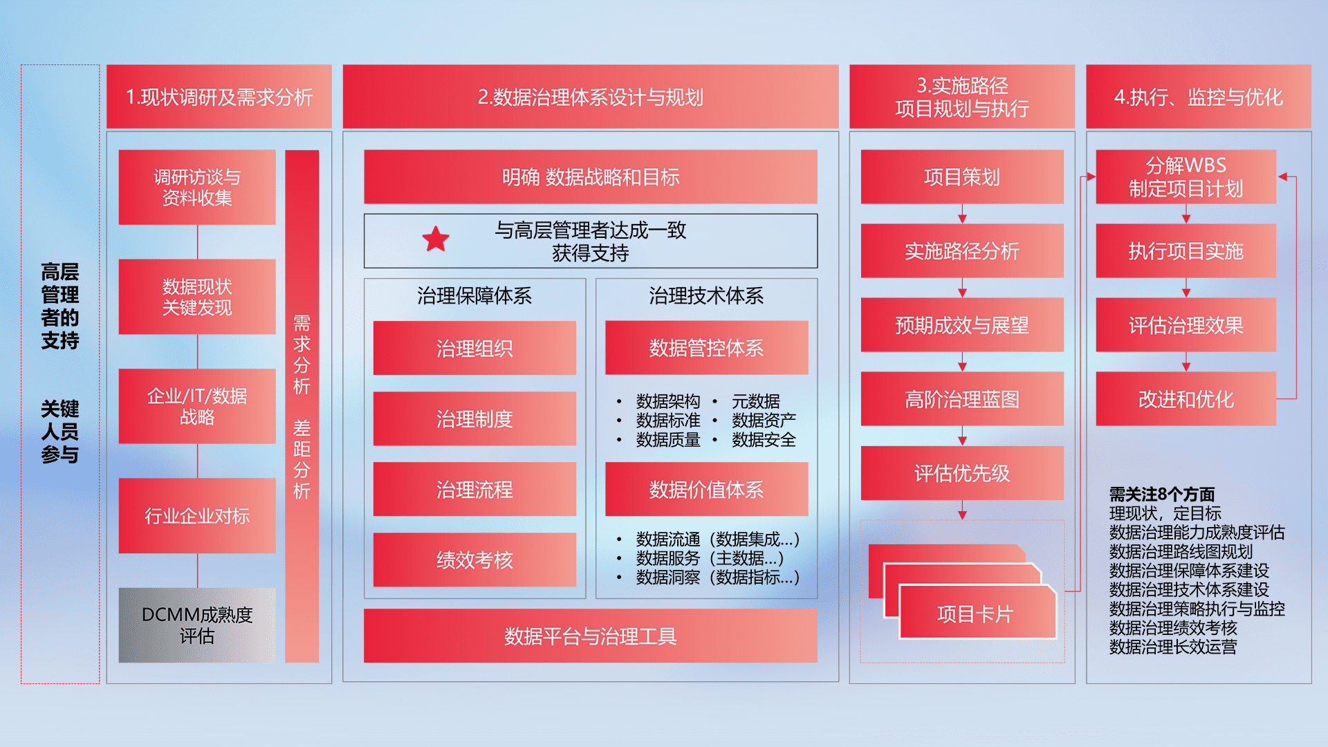 制定并执行统一的数据标准,,规范数据定义和格式,,,消除冗余和不一致性,,,,实现跨部门和跨系统的数据一致性,,,,为企业提供标准化的数据基础。。